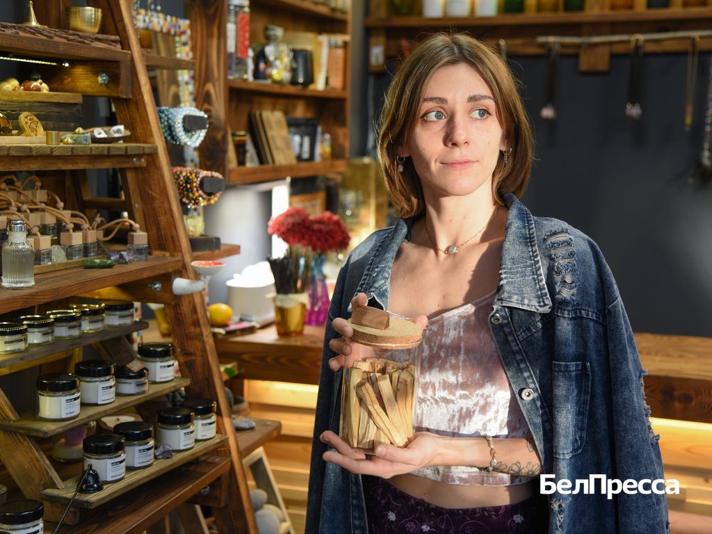 На стеллажах расположены упакованные свечи, баночки с благовониями, бутылочки с духами, подставки с браслетами, подвесками и кольцами из разнообразных камней. В мастерскую заходят в основном женщины. Они просят показать украшения, интересуются, как называется тот или иной камень и какими свойствами он обладает. Алина с радостью рассказывает о камнях – эта тема её конёк: