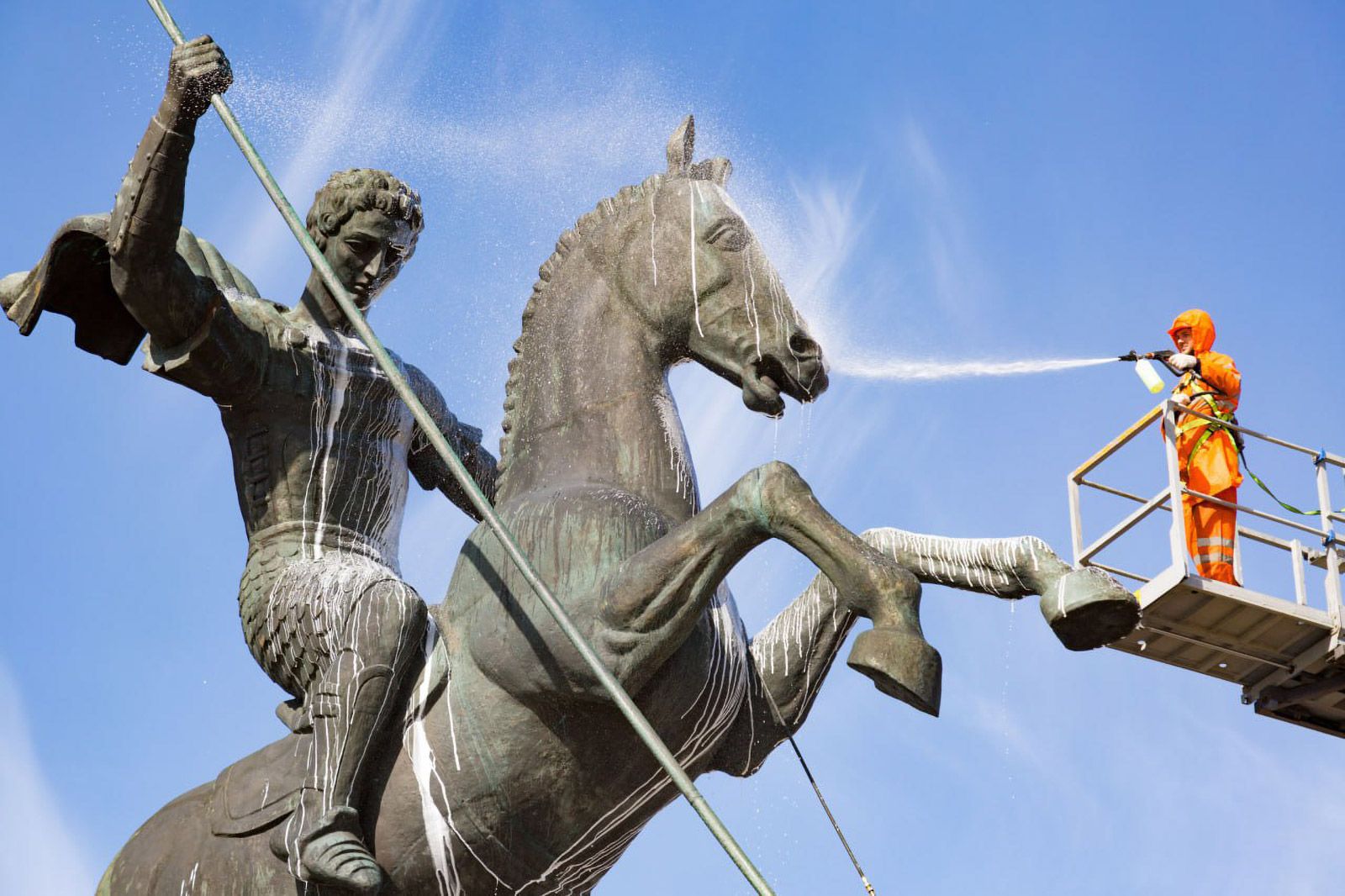 Особое внимание специалисты уделяют очистке скульптурных композиций, где много мелких деталей: каждую из них моют вручную с помощью мягких щеток. Для проведения работ на крупных объектах используют автогидроподъемники и поливомоечные машины.