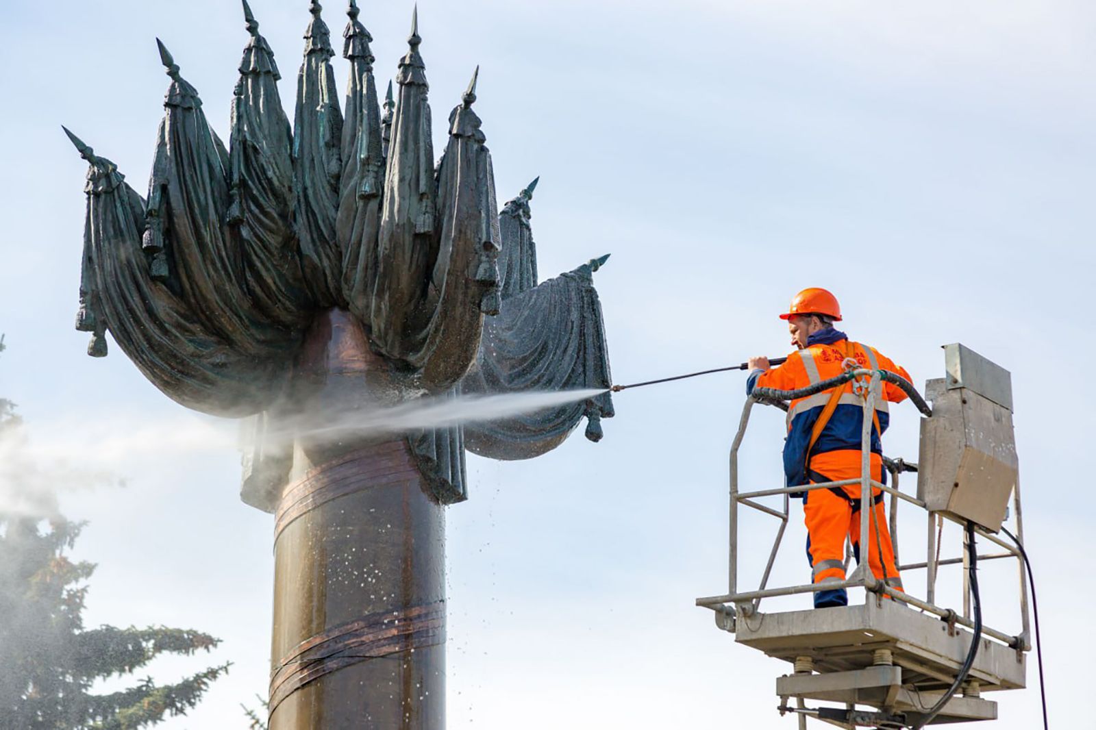 Памятники и фонтаны специалисты промоют вручную по особой технологии с использованием нейтральных моющих средств, которые не повреждают поверхности. Для промывки тоннелей и мостов используют щелочные растворы.
