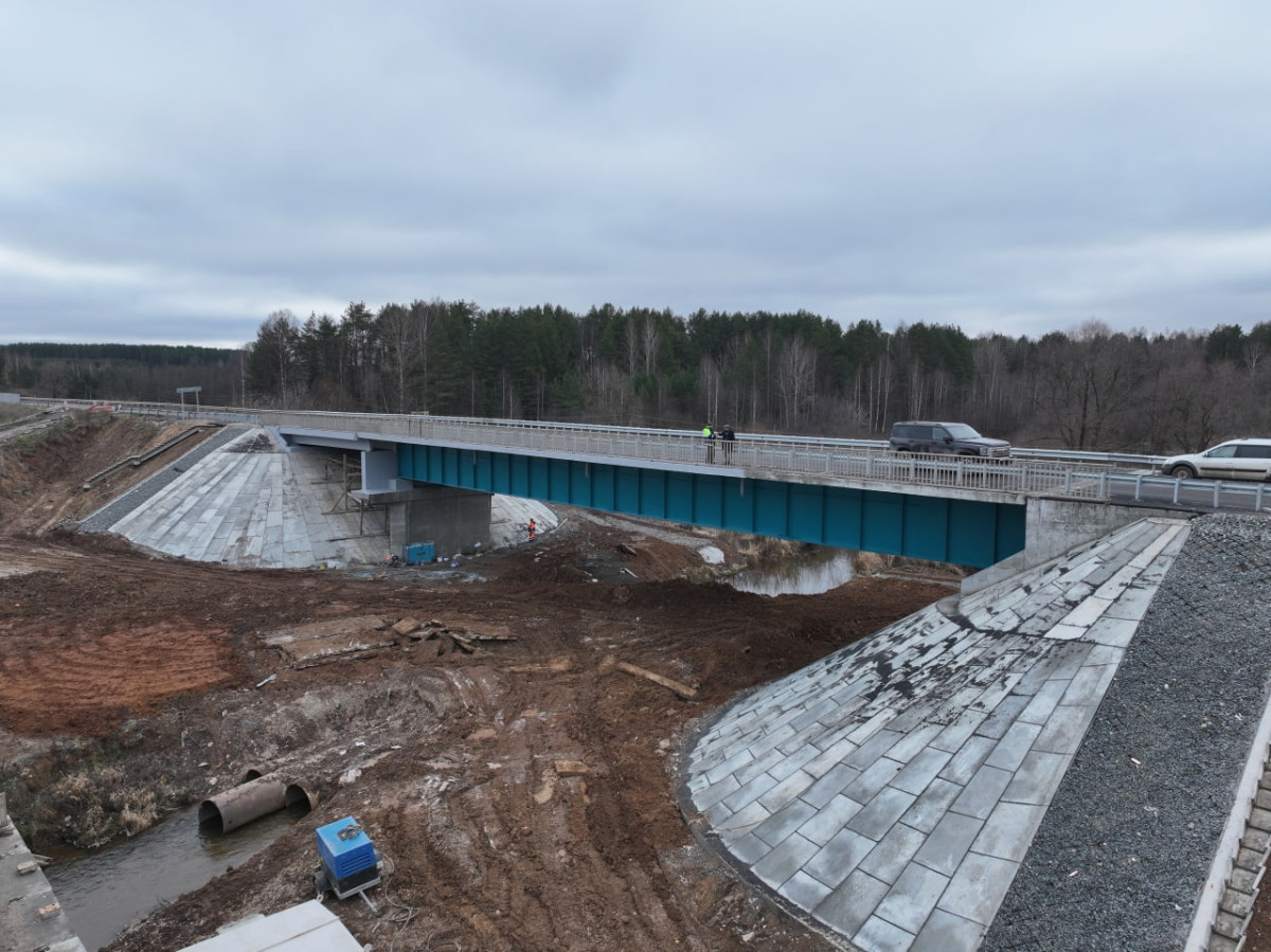 Недавно автомобильное движение по мосту было открыто. Сейчас подрядчик выполняет демонтаж временного моста и разбирает временную объездную дорогу.