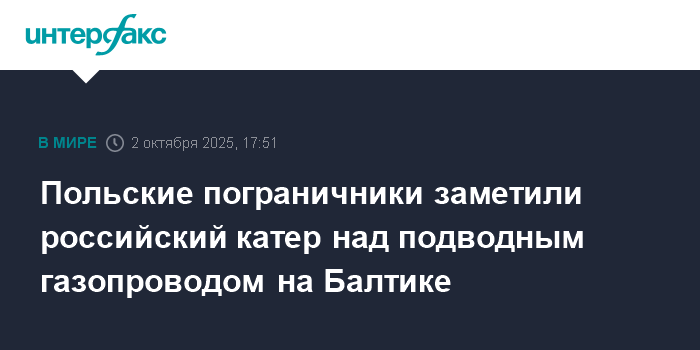 Москва. 2 октября. INTERFAX.RU - Польские морские пограничники отреагировали на появление российского катера в районе, где в Балтийском море пролегает подводный газопровод, сообщила Польскому телевидению представитель польского МВД Каролина Галецкая.