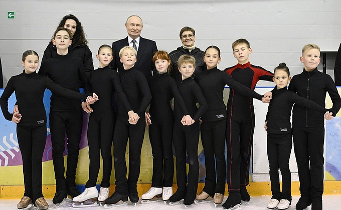 Президент ознакомился с информационными стендами, осмотрел ледовую арену и универсальный спортзал, побеседовал со спортсменами-фигуристами и баскетболистами – воспитанниками Специализированной детско-юношеской спортивной школы олимпийского резерва № 1.