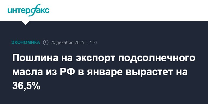 Москва. 25 декабря. INTERFAX.RU - Пошлина на экспорт подсолнечного масла из РФ в январе 2026 года повысится на 36,5%, до 9 298,6 рубля с 8 214,5 рубля за тонну в декабре, на подсолнечный шрот пошлина будет нулевой - впервые с октября 2022 года. Такой расчет представил Минсельхоз.