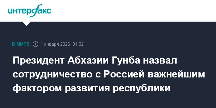 Москва. 1 января. INTERFAX.RU - Президент Абхазии Бадра Гунба в новогоднем телеобращении к гражданам страны, назвал сотрудничество Абхазии и России важнейшим фактором стабильности и развития республики. "Особое значение для нас имеет укрепление отношений со стратегическим союзником - Российской Федерацией. Наше сотрудничество в сфере безопасности, экономики, культуры и гуманитарных проектов остаётся важнейшим фактором стабильности и развития нашей страны. Мы благодарны за поддержку и будем развивать это партнёрство и дальше", - заявил он. Президент Абхазии назвал главной задачей наступившего года - "объединение абхазского общества, преодоление разногласий ради единой и главной цели - строительства сильного государства".