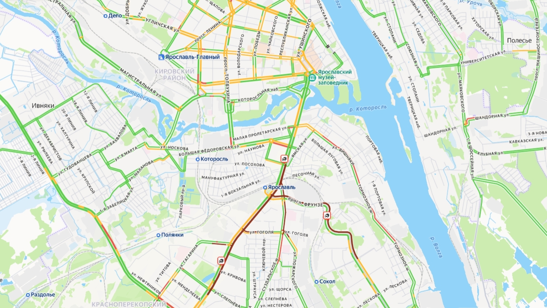 Ярославль сковали восьмибалльные пробки. В городе произошло три аварии: две на Московском проспекте и одна на проспекте Фрунзе. Эти улицы на карте пробок, а также Суздальское шоссе «окрасились» в бордовый цвет.