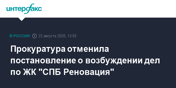 Москва. 22 августа. INTERFAX.RU - Прокуратура Санкт-Петербурга приняла решение отменить постановление о возбуждении двух уголовных дел, ранее заведенных по фактам мошенничества в ЖК "СПб Реновация", сообщил "Интерфаксу" источник в правоохранительных органах.