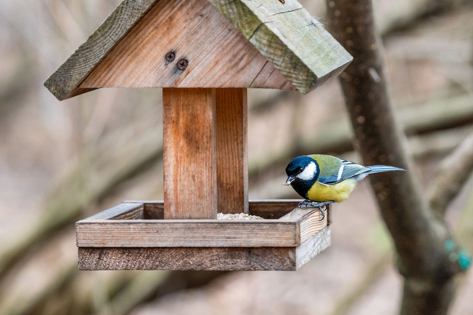Классическая кормушка в виде домика из древесины подойдет для мелких птиц и голубей. Она состоит из дна, крыши и четырех опор. Домик (площадью от 10 на 10 сантиметров до 40 на 40 сантиметров) следует снабдить бортиками, чтобы корм не высыпался. По углам орнитологи советуют оставить дренажные просветы между бортиками. Это позволит уходить лишней влаге после дождя и снега. Если нужно ограничить доступ крупных птиц, можно опустить крышу пониже.