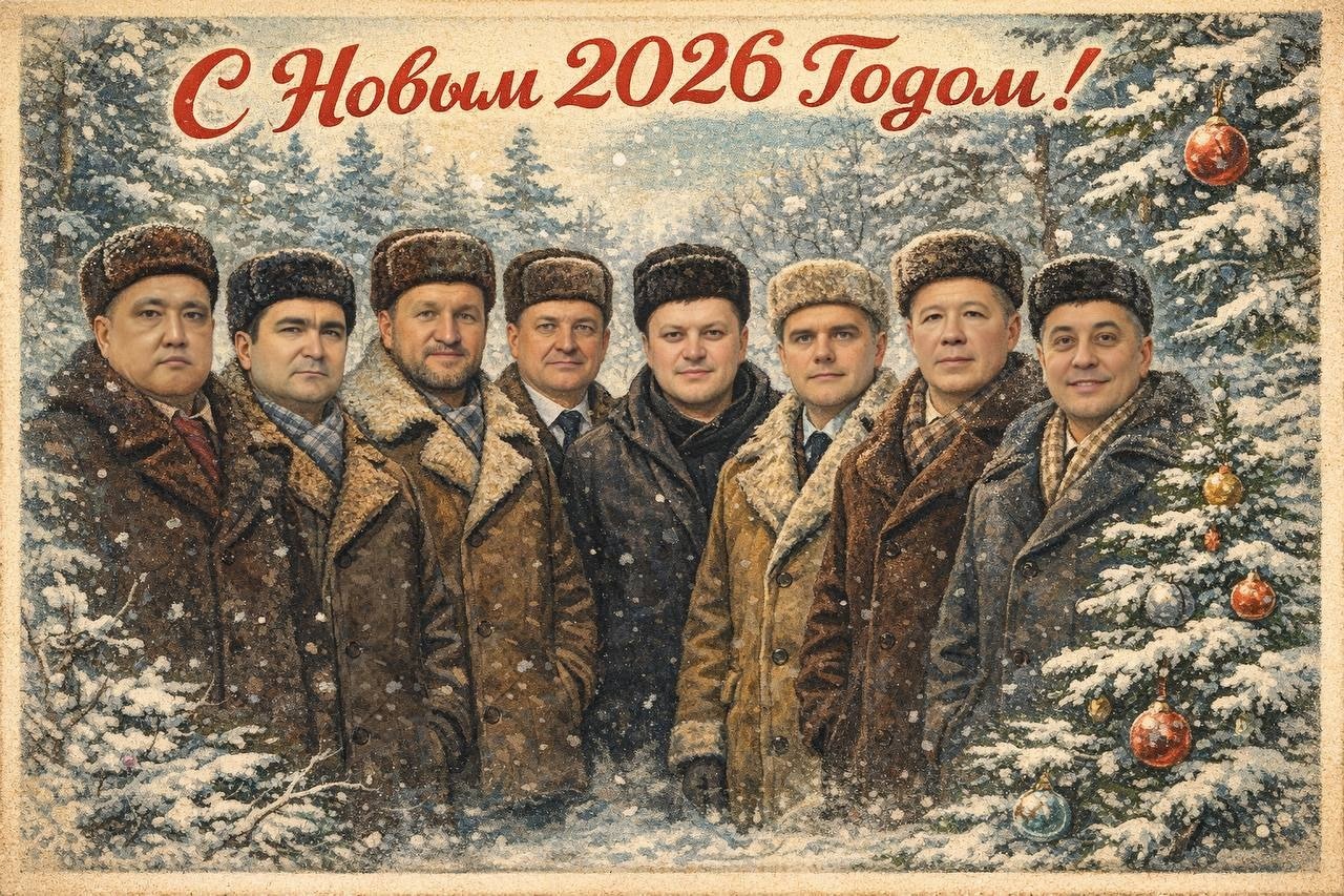 Радмир Мавлиев, Илвир Нурдавлятов, Айдар Базгутдинов, Олег Котов, Иван Иванов, Антон Тарасов, Рустем Хамитов и Газизьян Ахмедьянов стоят в зимней одежде на фоне заснеженного леса рядом с новогодней ёлкой.