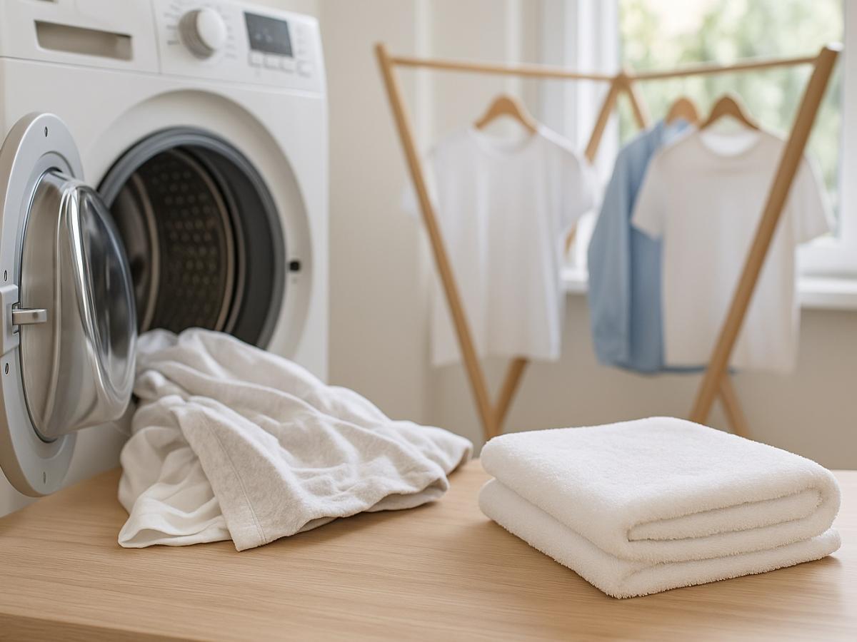 Фото: Generated by AI (DALL·E 3 by OpenAI) is licensed under Free for commercial use (OpenAI License) Стиральная машина и сушащиеся вещи В чём суть метода "Радуга"Техника строится на визуальном образе дуги: короткие вещи располагают в центре верёвки, а длинные — ближе к краям. Получается своеобразная арка, благодаря которой потоки воздуха легко проходят между слоями ткани. Влага испаряется быстрее, а сама одежда не теряет форму и не остаётся влажной в отдельных зонах.