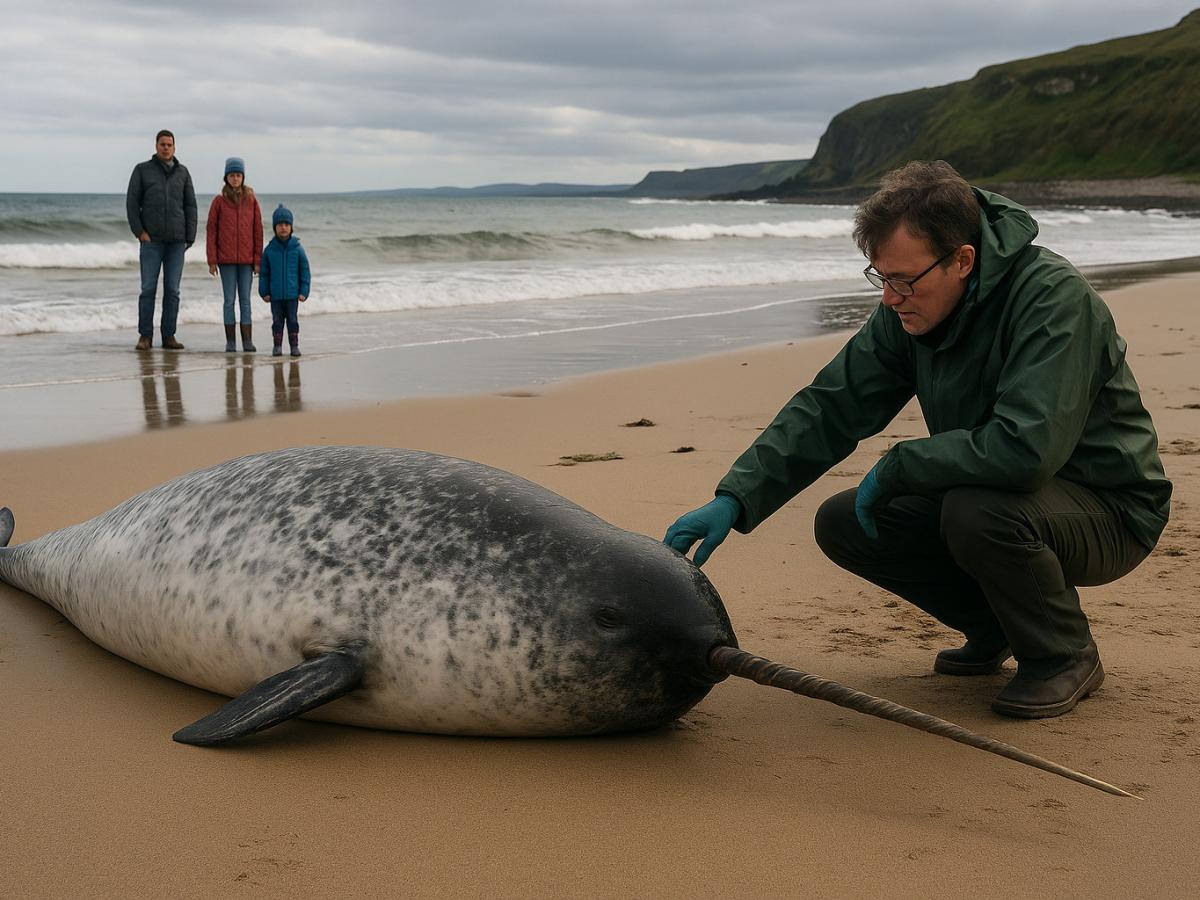 Фото: Generated by AI (DALL·E 3 by OpenAI) is licensed under Free for commercial use (OpenAI License) Нарвал на берегу Необычное появление арктического гостяИстория началась на уединённом пляже Свит-Неллис, куда семья отправилась на обычную прогулку. На берегу они увидели тушу крупного морского животного и сразу поняли, что находка может оказаться значимой для специалистов. Приехавшие позже эксперты подтвердили: перед ними молодая самка нарвала — вида, который не просто редко появляется за пределами Арктики, но и никогда раньше не фиксировался в ирландских водах. Для исследователей это стало значительным событием, ведь подобные случаи помогают проследить изменения в поведении и миграциях морских млекопитающих.
