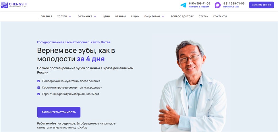 Широкий выбор материалов, опытные врачи, проходящие стажировки за рубежом, и компьютерные системы, повышающие точность имплантации — все это делает лечение не только эффективным, но и безопасным. Для удобства пациентов разработана четкая 6-этапная схема: от отправки снимка челюсти до возвращения домой. Все время пребывания в Китае вас сопровождает личный гид с автомобилем, а проживание предоставляется бесплатно. Цены в 3 раза ниже российских, скидка 20% для пенсионеров и возможность частичной компенсации проезда — дополнительные бонусы, которые делают Chinesestom привлекательным выбором для тех, кто ценит прозрачность, надежность и личный подход.