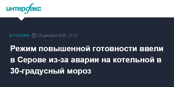 Москва. 25 декабря. INTERFAX.RU - Режим повышенной готовности ввели в городе Серов Свердловской области, там накануне из-за аварии пришлось понизить подачу тепла.