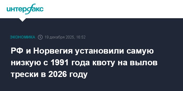 Москва. 19 декабря. INTERFAX.RU - Общая квота России и Норвегии на вылов трески в 2026 году, согласно решению смешанной российско-норвежской комиссии по рыболовству (СРНК), будет самой низкой с 1991 года и составит 285 тыс. тонн. Это на 16% меньше по сравнению с 2025 годом.