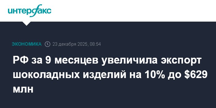 Москва. 23 декабря. INTERFAX.RU - Россия за 9 месяцев 2025 года экспортировала шоколадных кондитерских изделий почти на $629 млн, что на 10% больше, чем за аналогичный период 2024 года. Об этом сообщает федеральный центр "Агроэкспорт" со ссылкой на оценки экспертов.