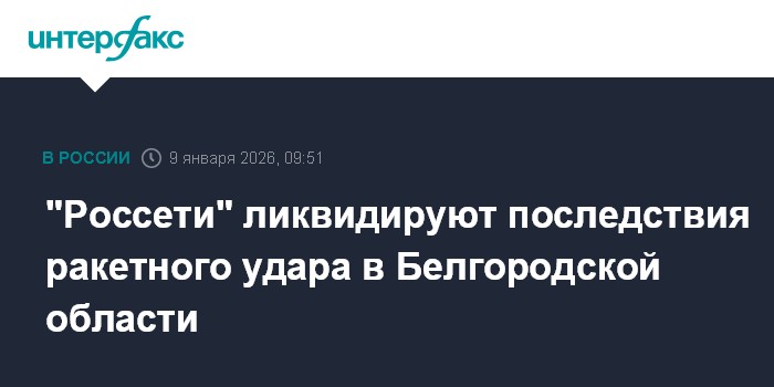 Москва. 9 января. INTERFAX.RU - Энергетики "Россетей" восстанавливают электроснабжение потребителей Белгородской области, нарушенное при ракетном ударе минувшей ночью, сообщила компания в пятницу.