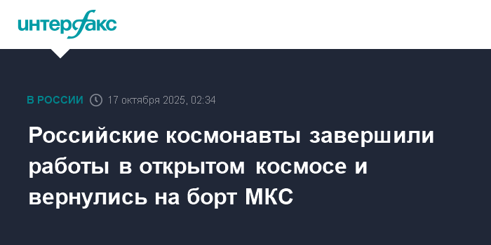 Москва. 17 октября. INTERFAX.RU - Космонавты "Роскосмоса" Сергей Рыжиков и Алексей Зубрицкий завершили работы в открытом космосе по установке научной аппаратуры на внешней поверхности Международной космической станции (МКС), следует из трансляции госкорпорации.