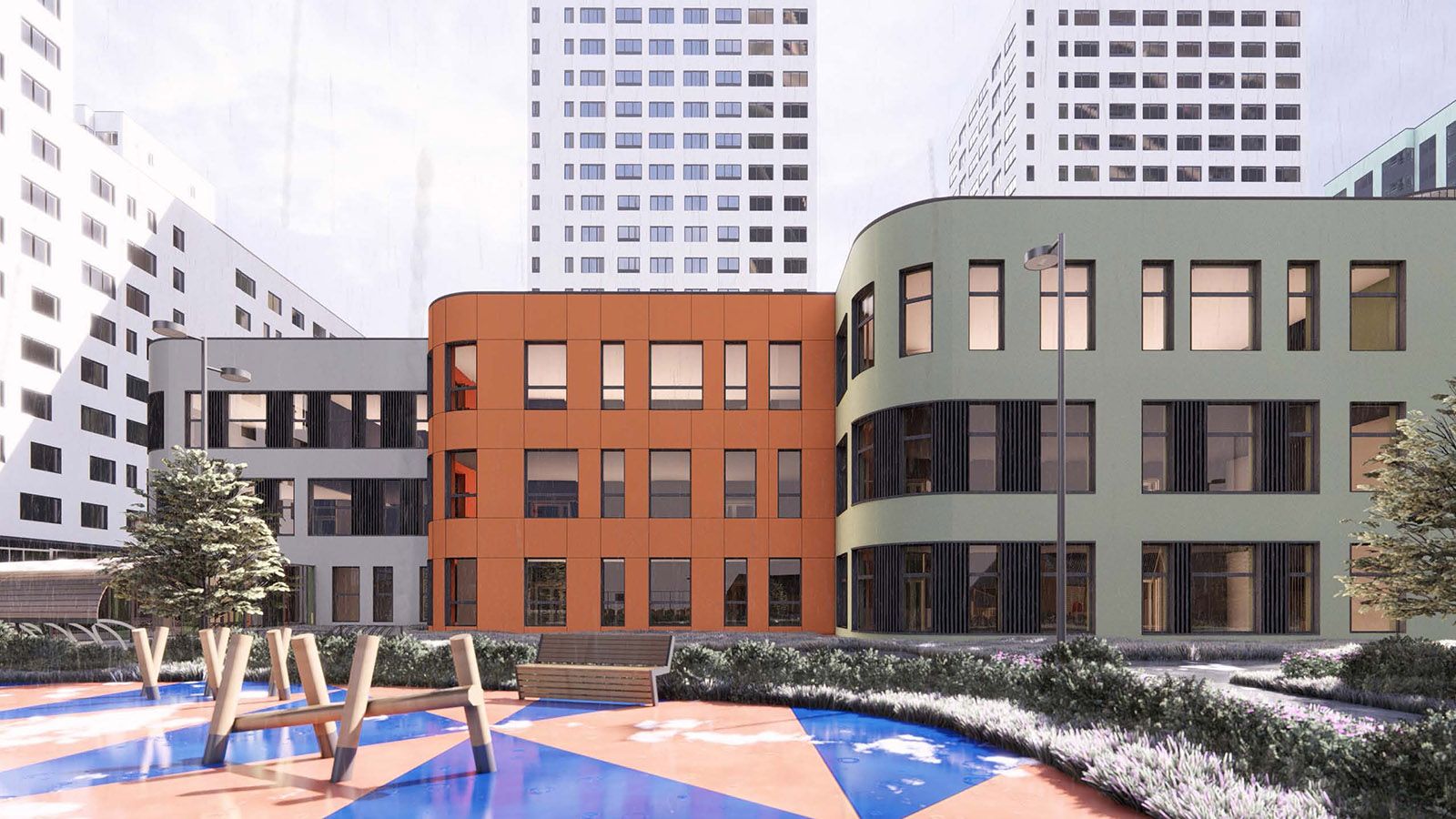 Рядом также строится образовательный комплекс. Здание площадью почти 25 тысяч квадратных метров рассчитано на 1,1 тысячи школьников и 300 воспитанников детского сада.