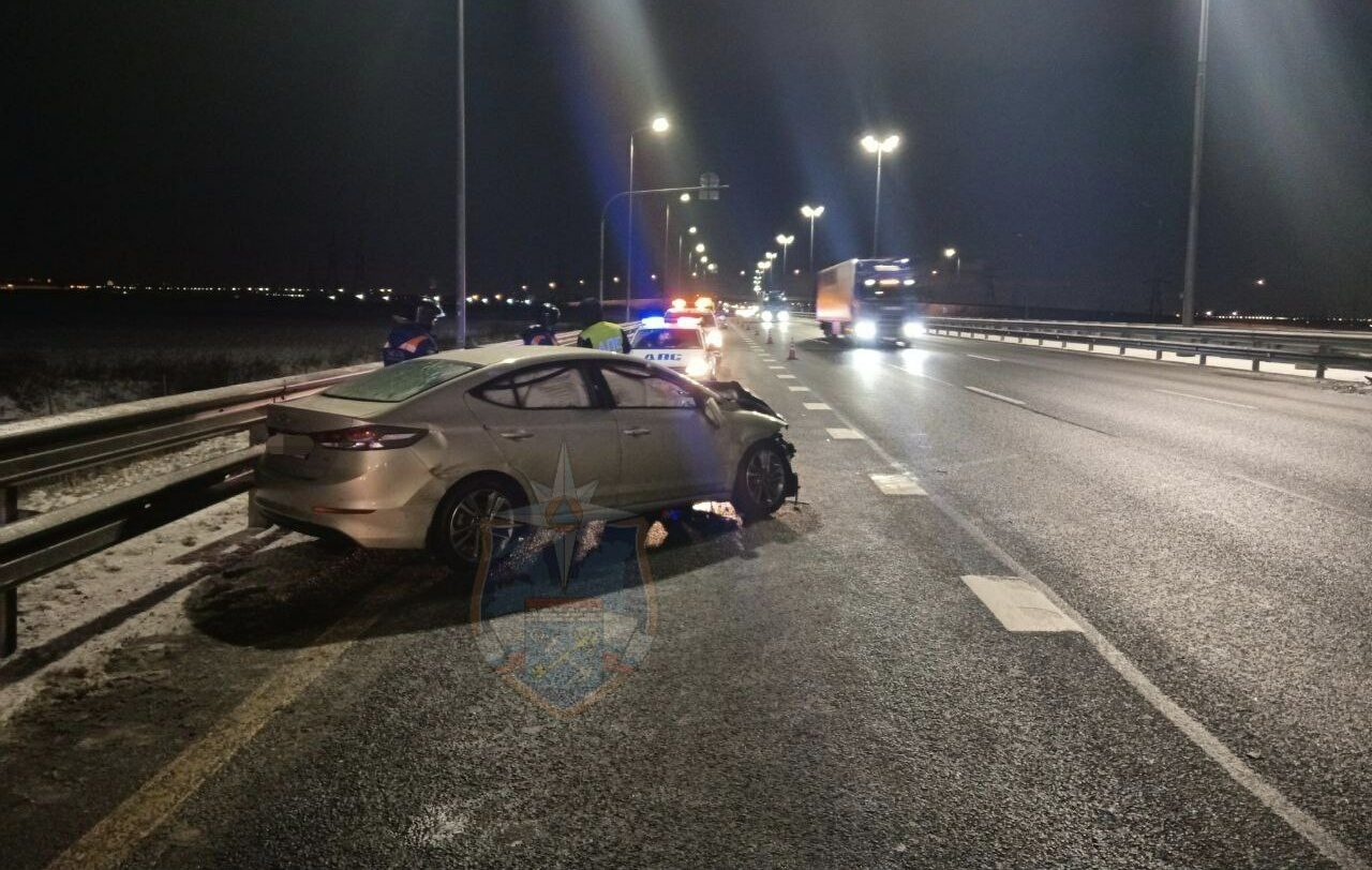 Пресс-служба аварийно-спасательной службы Ленинградской области сообщает, что водитель автомобиля Хендай не справился с управлением, в результате чего автомобиль столкнулся с барьерным ограждением.