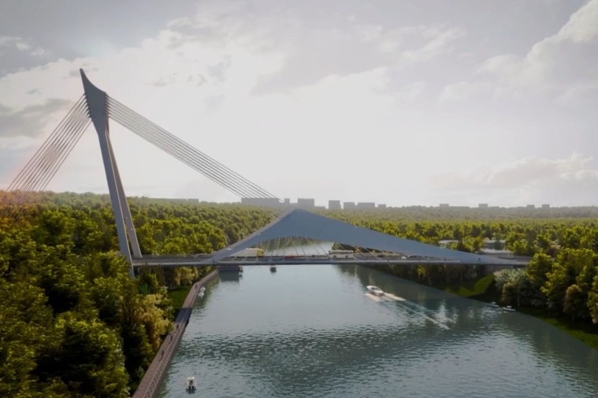 По словам градоначальника, уже установлены две большие секции пролета — над левым берегом и руслом реки. «Сейчас производим работы по укрупнительной сборке металлоконструкций. Потом начнем монтировать пролетное строение над правым берегом и возводить 86-метровый пилон — он станет опорой всей конструкции», — утончил он.