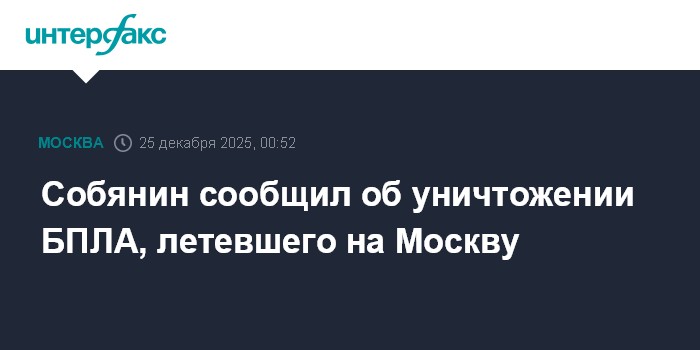 Москва. 25 декабря. INTERFAX.RU - Средствами ПВО нейтрализован БПЛА, летевший на Москву, сообщил мэр столицы Сергей Собянин.