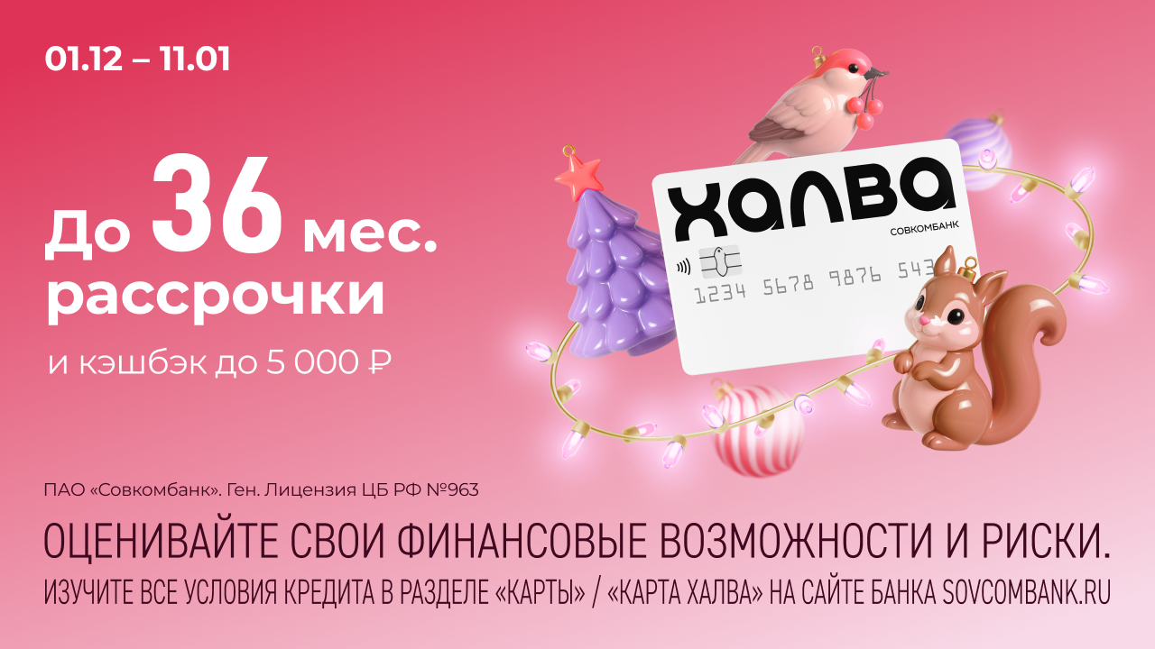 Совкомбанк и «Халва» запускают акцию «Новогодний бум»: получите кэшбэк до 5000 рублей, рассрочку до 36 месяцев и ценные призы в суперфинале