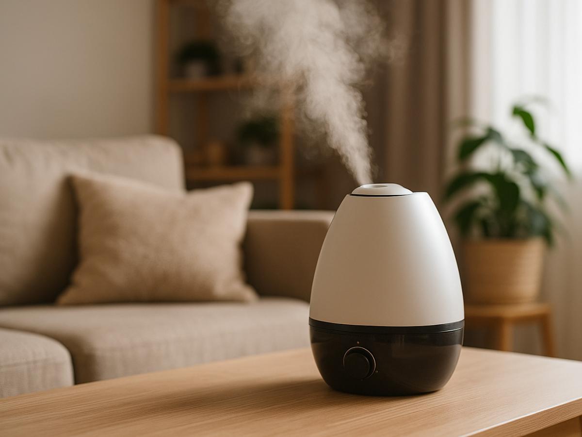 Фото: Generated by AI (DALL·E 3 by OpenAI) is licensed under Free for commercial use (OpenAI License) современный увлажнитель на столе в гостиной Что такое влажность и от чего зависит ее уровеньВлажность воздуха — это показатель содержания воды в воздухе, измеряемый в процентах. Ученые называют ее относительным понятием, рассчитывая через специальную формулу, но для повседневной жизни достаточно использовать измерительный прибор, называемый гигрометром.
