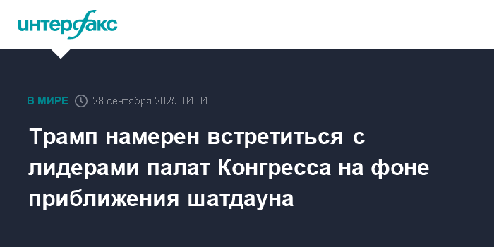 Москва. 28 сентября. INTERFAX.RU - Президент США Дональд Трамп в понедельник в условиях приближающегося шатдауна - остановки работы правительства - планирует встретиться с лидерами республиканцев и демократов в Палате представителей и Сенате, сообщил телеканал NBC News со ссылкой на источники в Белом доме и Конгрессе.
