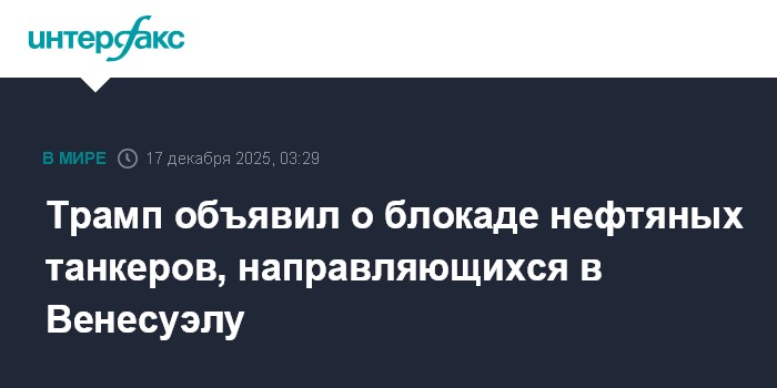 "Сегодня я отдаю приказ о полной блокаде всех нефтяных танкеров, на которые распространяются санкции, следующих в Венесуэлу и из нее", - написал Трамп в соцсети Truth Social.