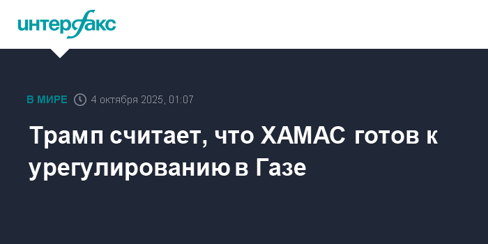 Москва. 4 октября. INTERFAX.RU - Президент США Дональд Трамп заявил, что считает движение ХАМАС готовым к урегулированию конфликта в секторе Газа и потому призвал Израиль остановить удары по этой палестинской территории.