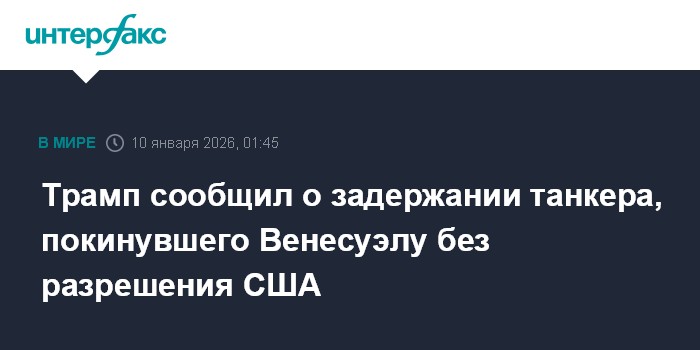 Москва. 10 января. INTERFAX.RU - Американский президент Дональд Трамп заявил, что США совместно с временными властями Венесуэлы захватили танкер, покинувший Венесуэлу без разрешения Соединенных Штатов.