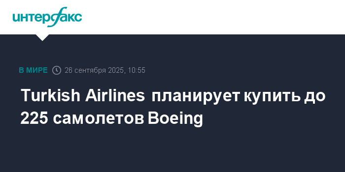 Москва. 26 сентября. INTERFAX.RU - Турецкая авиакомпания Turkish Airlines намерена приобрести до 225 самолетов Boeing Co. для расширения и модернизации своего парка.
