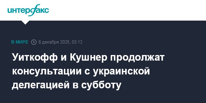 Москва. 6 декабря. INTERFAX.RU - Спецпосланник президента США Стив Уиткофф и Джаред Кушнер в субботу продолжат обсуждение с украинской стороной путей завершения конфликта на Украине, сообщил американский госдепартамент.