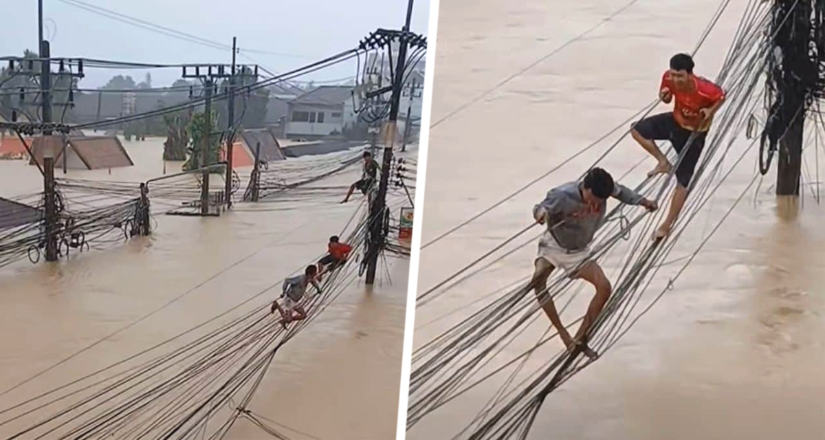Ужасные кадры из Таиланда: люди спасаются, передвигаясь по проводам во время смертельного наводнения