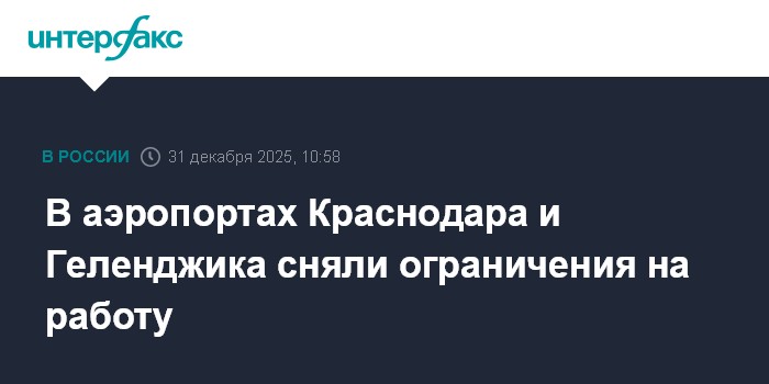 Москва. 31 декабря. INTERFAX.RU - Аэропорты Краснодара и Гелегджика возобновили обслуживание рейсов, сообщил в среду представитель Росавиации Артем Кореняко в своем телеграм-канале.