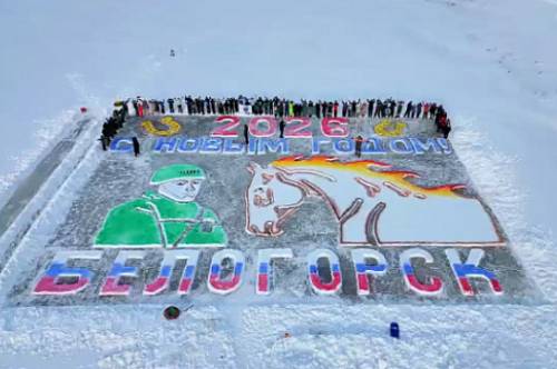 Около ста жителей Белогорска создали новогоднюю открытку на льду. Ее посвятили защитникам Отечества.