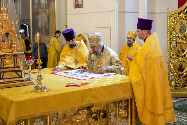 Богослужение совершалось перед ковчегом с частицей мощей Святителя Николая. Она больше 12 лет постоянно прибывает в кафедральном соборе праведного воина Феодора Ушакова.