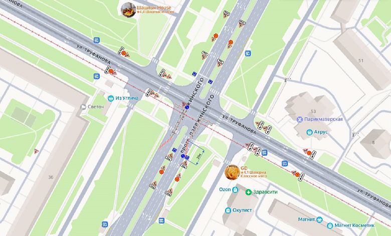 Также по 1,5 крайних полосы будут перекрыты на участке Дзержинского проспекта в районе пересечения с улицей Труфанова в обоих направлениях с 23:00 10 октября до 16:00 11 октября и с 23:00 11 октября до 16:00 12 октября.