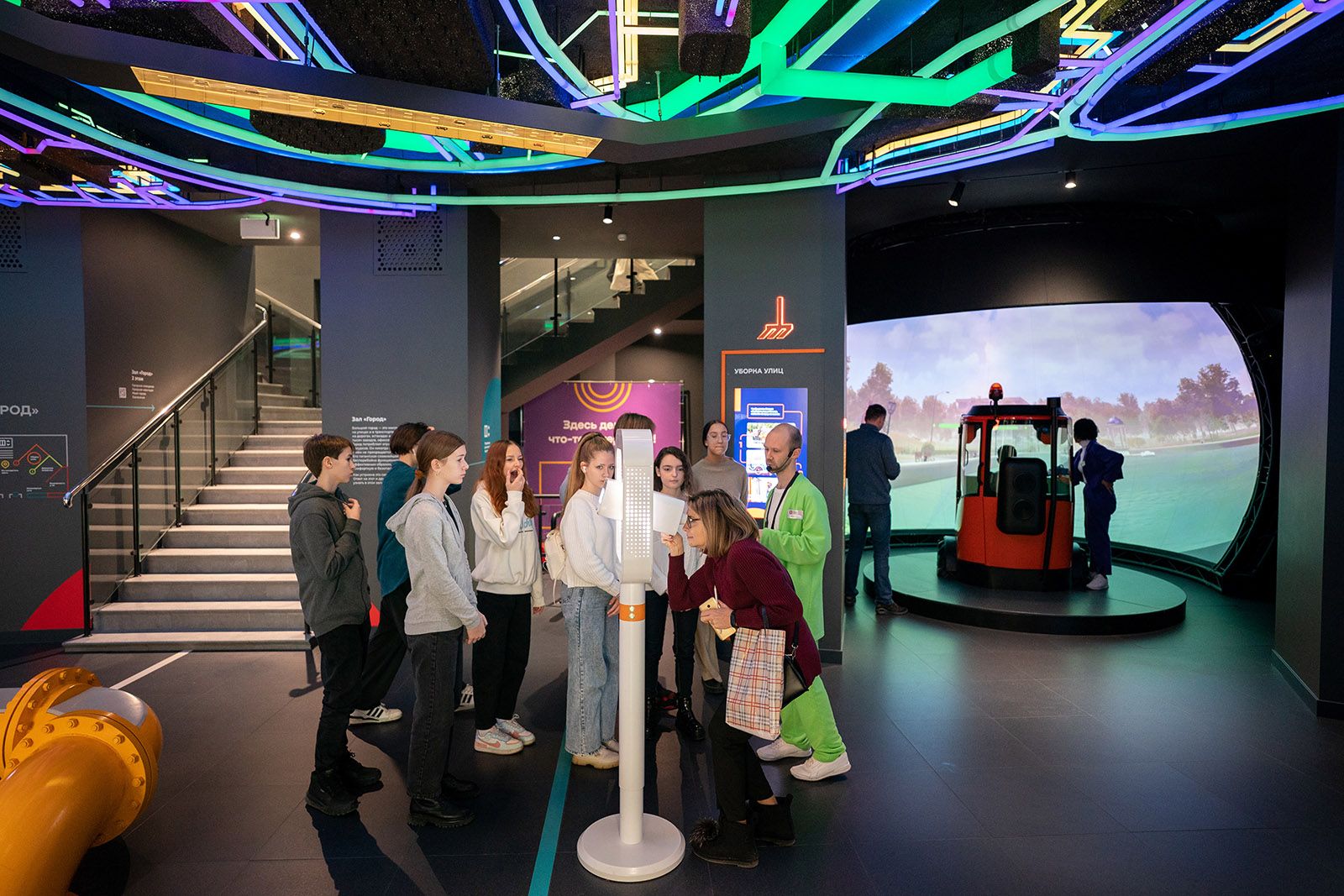 За информационным табло — зал, где можно узнать, как в городские квартиры поступают электричество, тепло, газ и вода. Здесь гости могут ознакомиться с принципами работы парогазовой установки теплоэлектроцентрали (ТЭЦ) и станций водоподготовки.