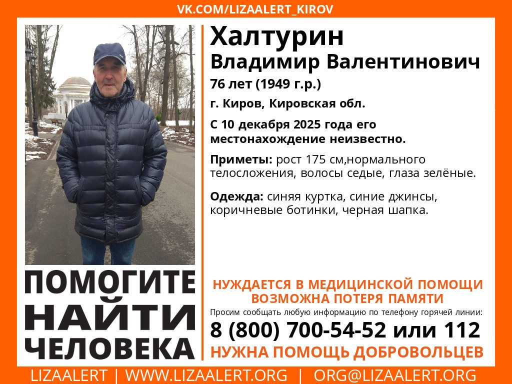 10 декабря в Кирове пропал без вести 76-летний Владимир Халтурин. До сих пор о его местонахождении ничего не известно.