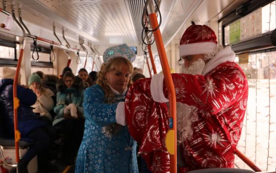 В Курске пассажиров новогоднего трамвая поздравили Дед Мороз и Снегурочка