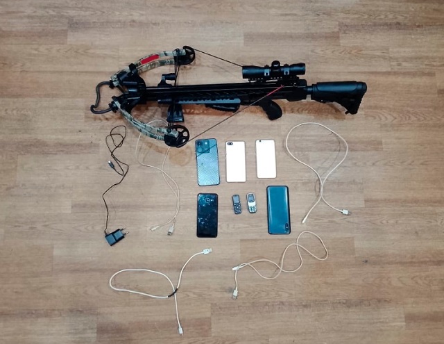 Сотрудники оперативного отдела и отдела режима и надзора обнаружили у нарушителя 7 мобильных телефонов, зарядное устройство, 4 провода к нему и арбалет.