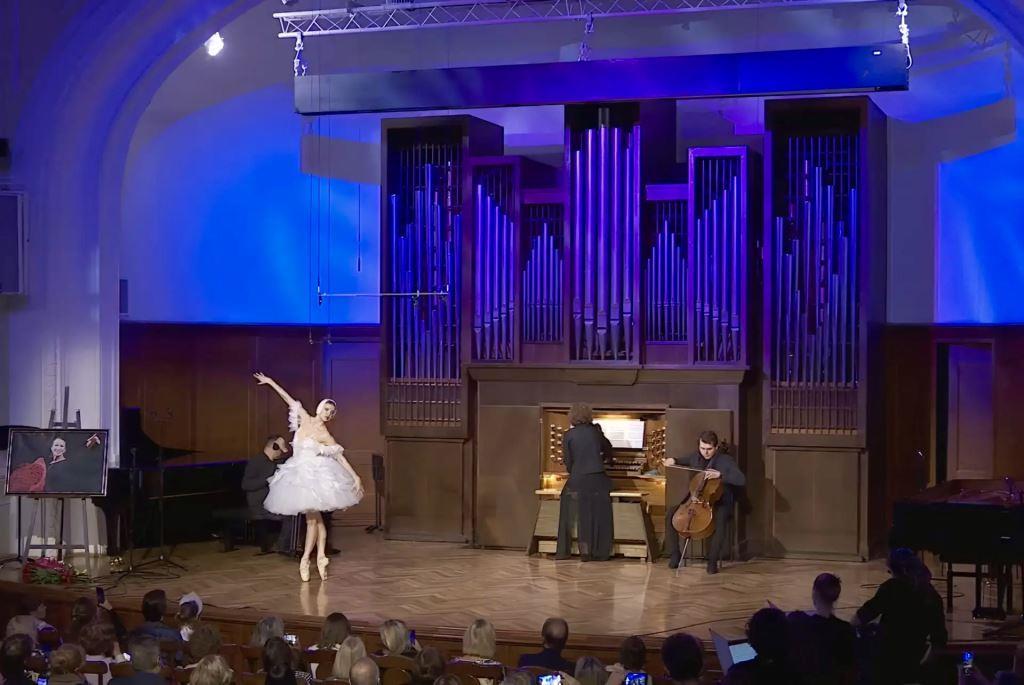 Также были исполнены фрагменты балетных партитур, где блистала Плисецкая: «Кармен», «Болеро», «Умирающий лебедь» – этот номер на музыку Сен-Санса (в транскрипции для виолончели, хора и органа Н. Чанба) исполнила представительница современного поколения – народная артистка России, прима-балерина МАМТ имени Станиславского и Немировича-Данченко Наталья Сомова.