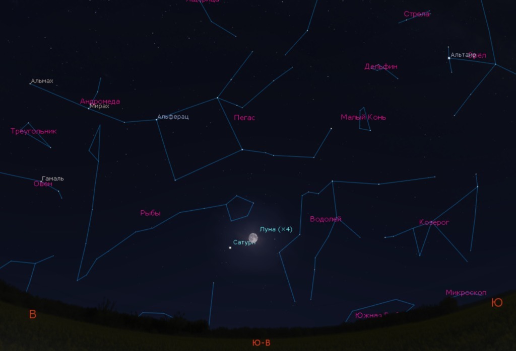 Над горизонтом они появятся почти одновременно: в 18:11 взойдет Луна, а Сатурн взойдет на 16 минут позже. Вечером они будут видны невысоко над горизонтом на юго-востоке. Наиболее высоко над горизонтом –на высоту 32 градуса- они поднимутся в полночь и будут видны на юге.