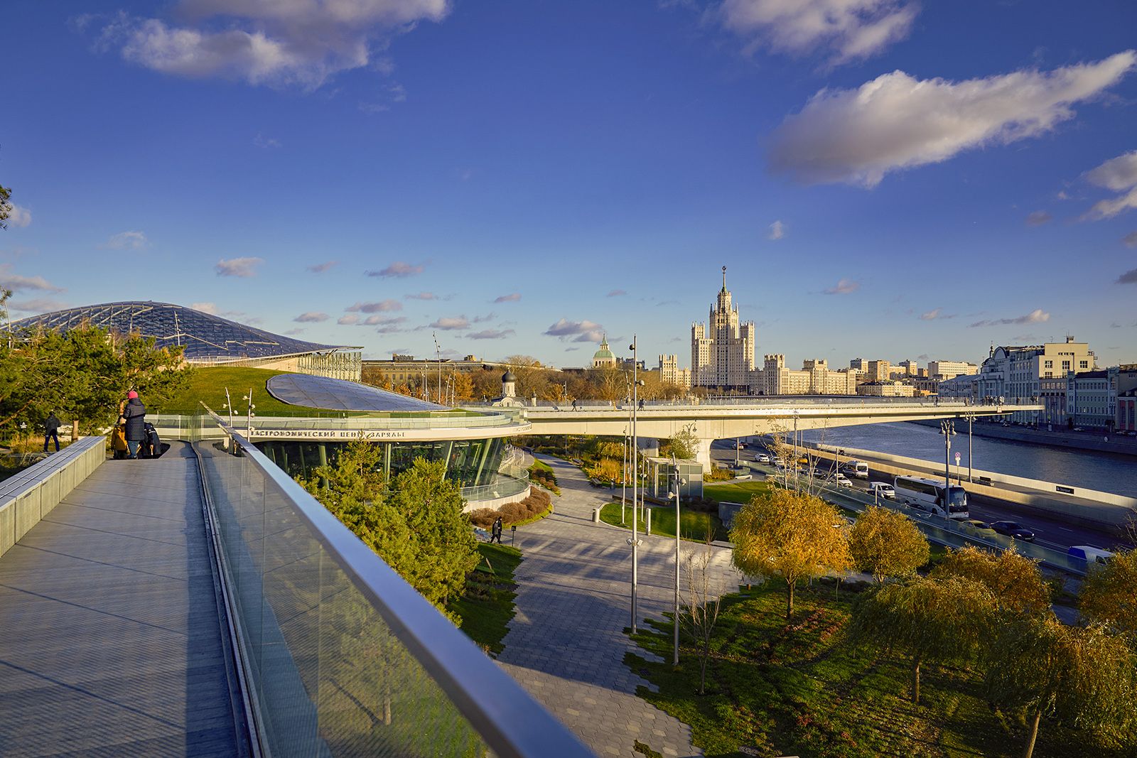 Парящий мост в парке «Зарядье» — один из самых известных пешеходных мостов в столице, уникальная смотровая площадка, возвышающаяся над Москвой-рекой без единой опоры. С моста можно увидеть собор Покрова Пресвятой Богородицы на Рву, Спасскую башню Кремля, а также высотку на Котельнической набережной.