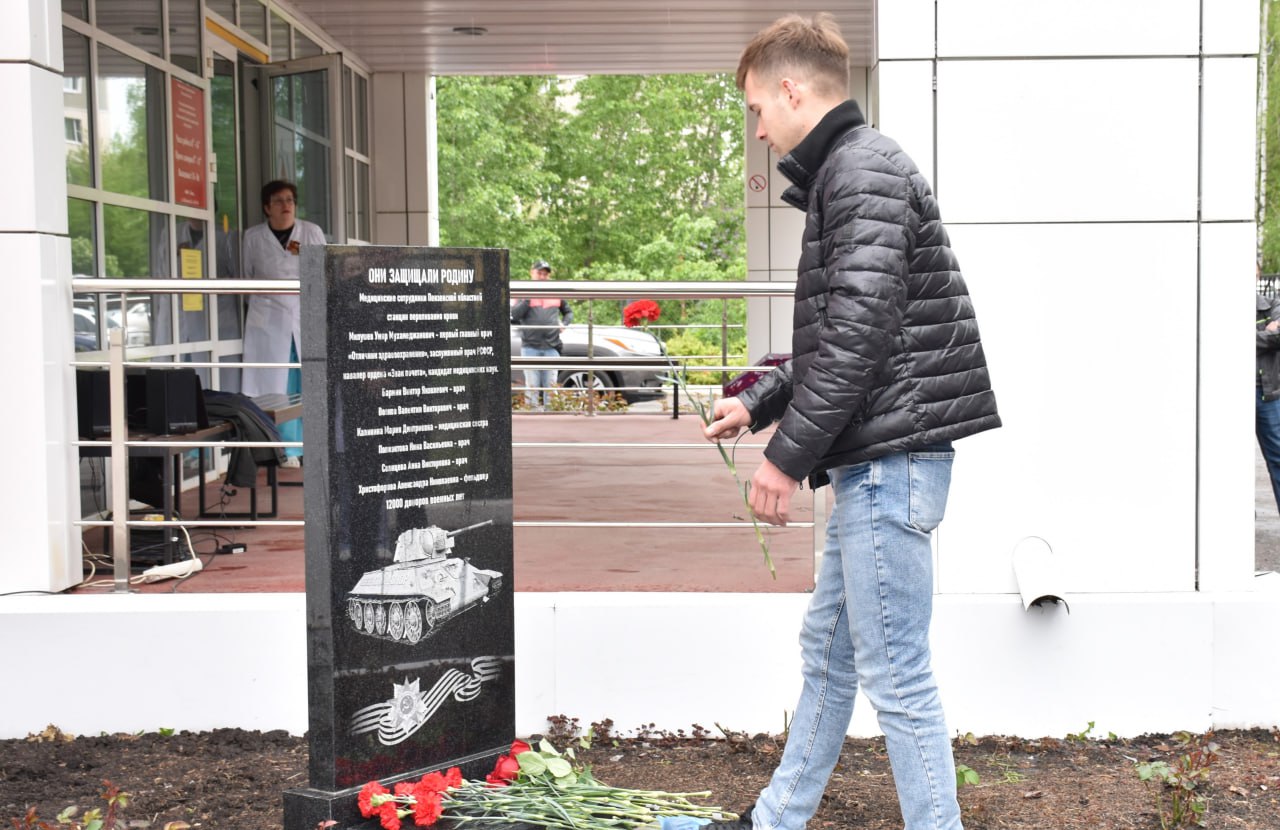 На памятной стеле из тёмного гранита увековечены имена врачей и сотрудников, внесших вклад в Победу: Умяра Милушева, Виктора Бармина, Валентины Волковой, Нины Полиэктовой, Анны Солнцевой, Марии Калининой и Александры Христофоровой.