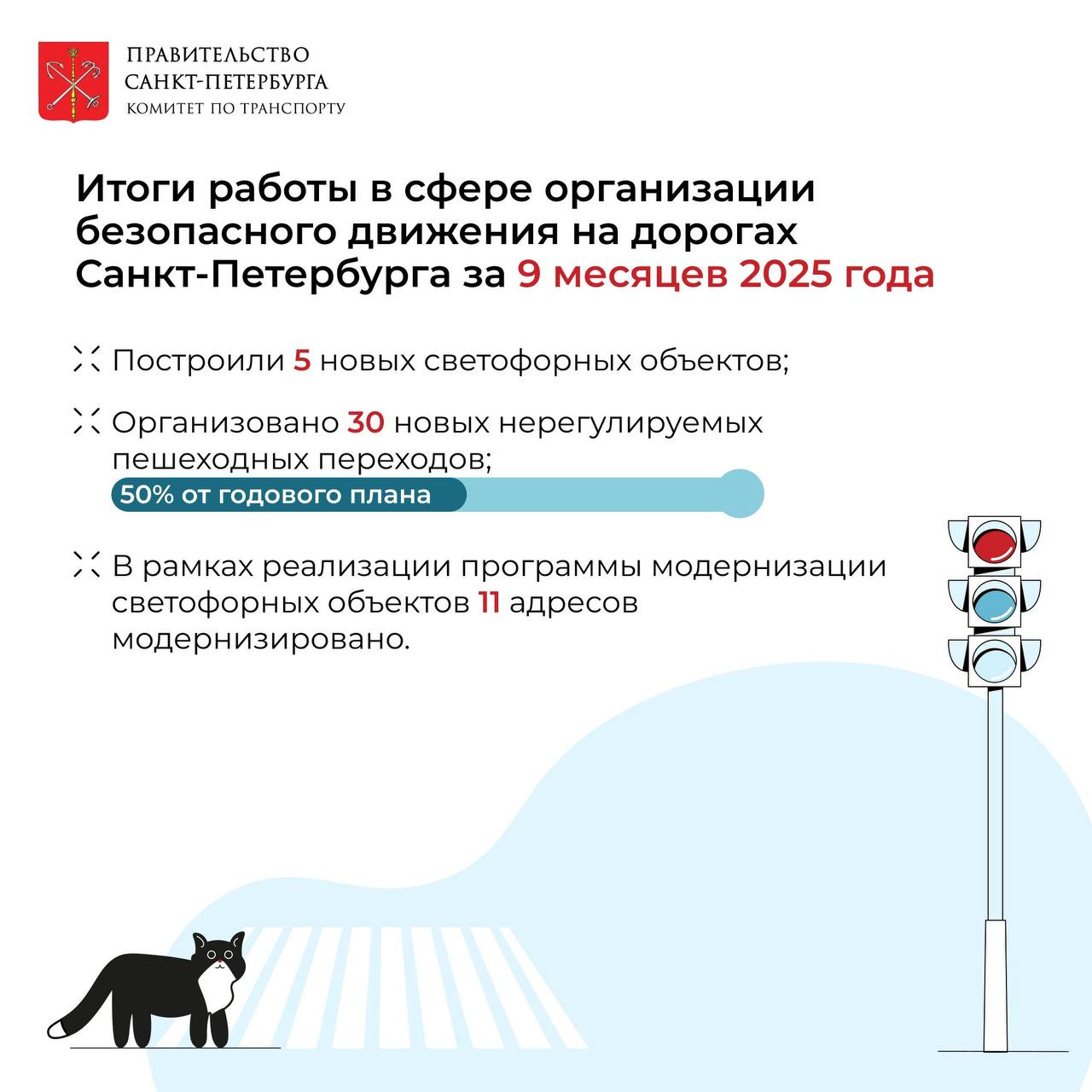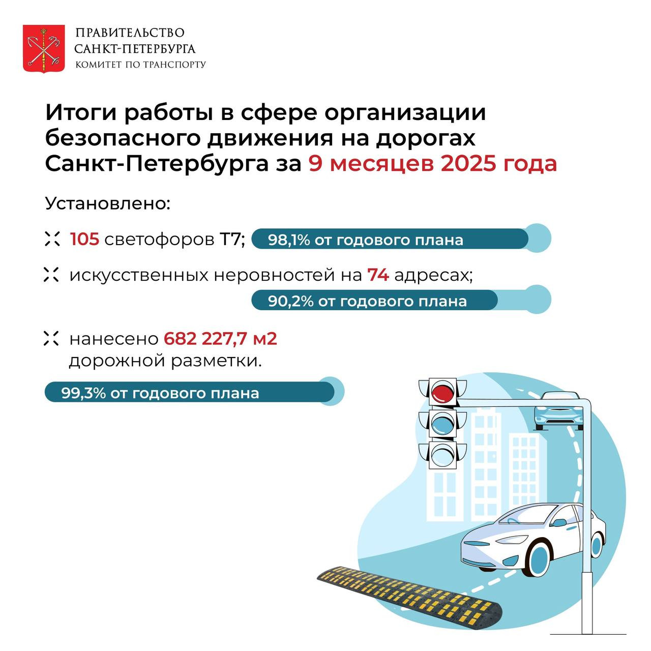 Так, построены 5 новых светофоров и модернизированы 11 уже существующих. Кроме того, на 52 адресах установили 105 современных светофоров типа Т.7. Также заменили 5 627 дорожных знаков и нанесли 682 227,7 квадратных метра дорожной разметки, сообщает пресс-служба комитета.