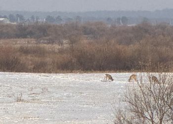 Заснеженное поле в Ивановском округе Приамурья привлекло трех косуль. Дикие козы облюбовали территорию, на которой осталась соя после уборки.
