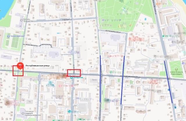 Закрыты для проезда пересечения: ул. Республиканская - ул. Кирова, ул. Республиканская - ул. Грузинская.