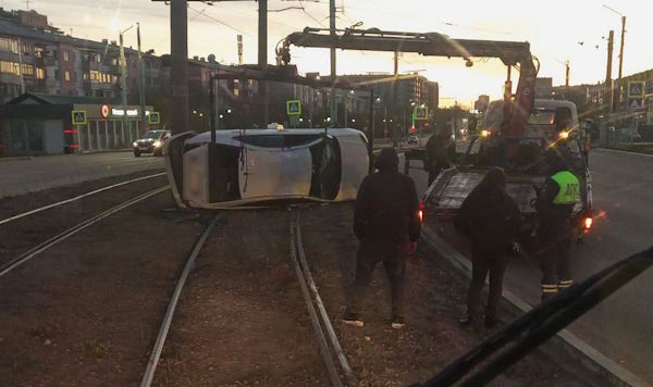 В Улан-Удэ пьяный водитель вылетел на трамвайные рельсы и перевернулся