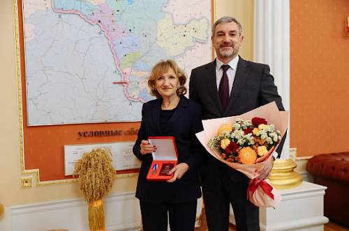 Губернатор Василий Орлов вручил медаль «За заслуги перед Амурской областью» II степени Людмиле Антоновне Якуниной — исполнительному директору дорожного предприятия в Ивановке.